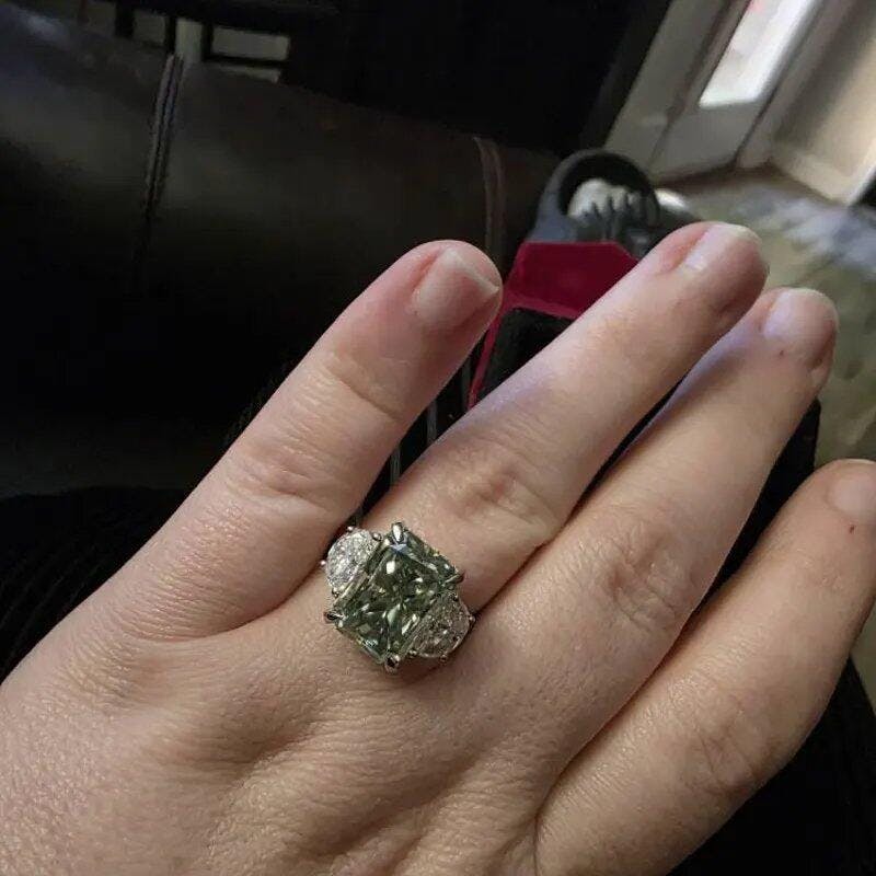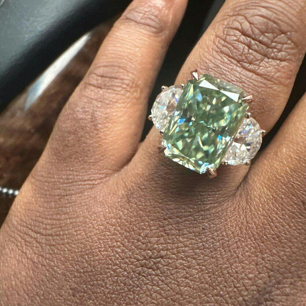 This ring is breathtaking! The radiant cut light green moissanite is so vibrant and sparkly. The three-stone design makes it feel grand, elegant, and full of meaning. I’m in love with how it looks on my hand.