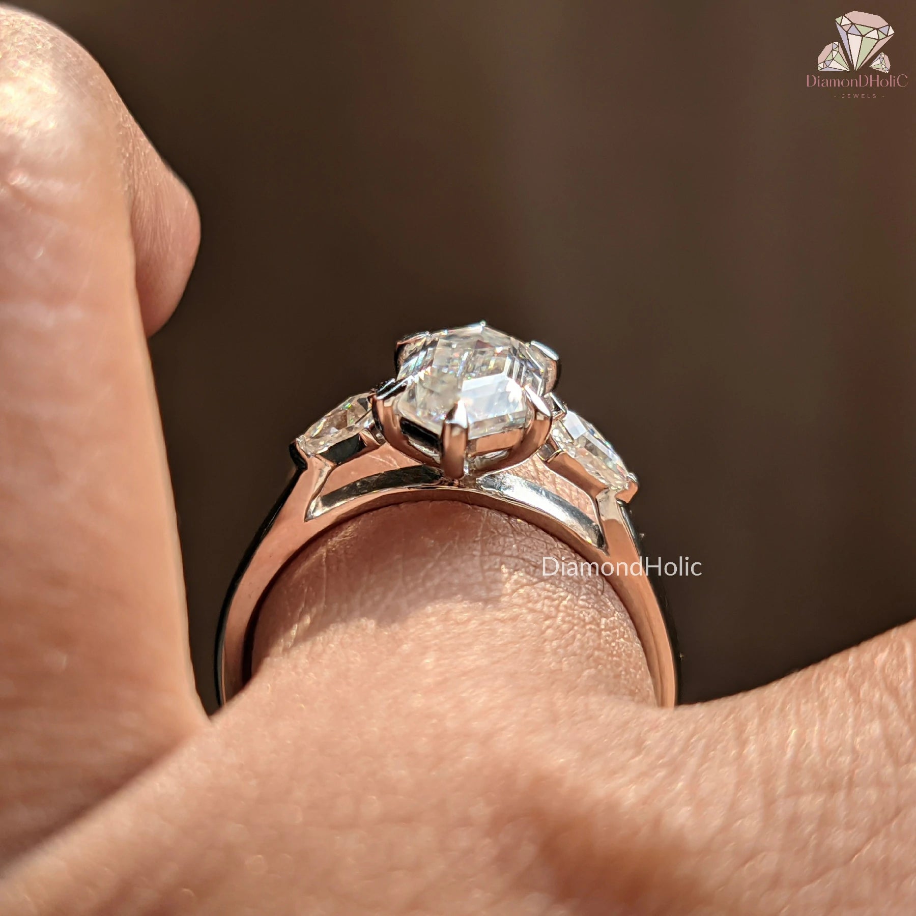 Hexagon-Cut Moissanite ring accented with brilliant kite-shaped side stones. This three-stone design blends modern geometry with timeless elegance, creating the perfect engagement or anniversary ring. Handcrafted for exceptional sparkle and luxurious fine jewelry appeal.