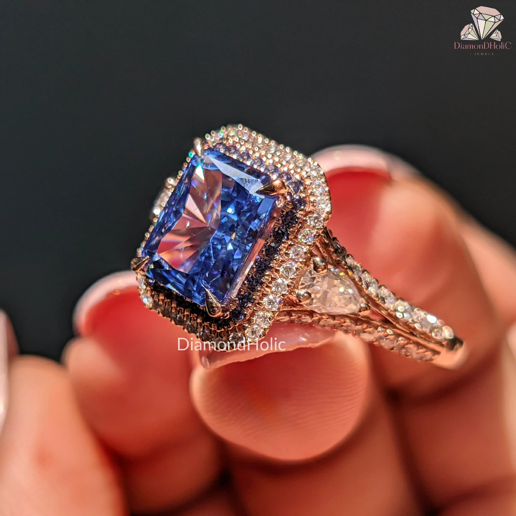Three Stone-Art Deco Royal Blue CZ Radiant Cut Wedding Ring With Pear Side Stone