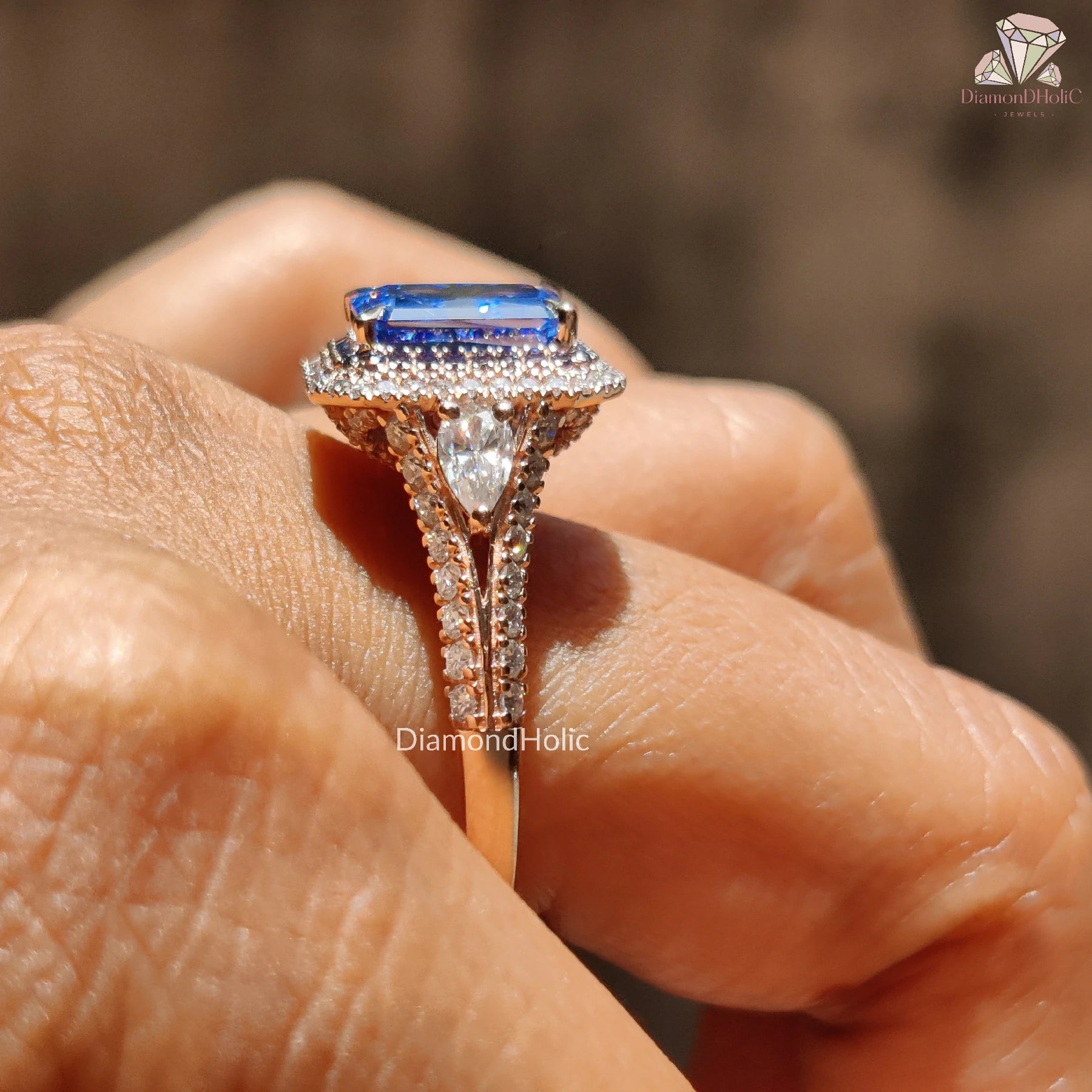 Royal Blue Radiant-Cut CZ center stone sits in a double halo, accented by shimmering pear-shaped side stones. This Art Deco-inspired three-stone ring in rose gold delivers bold color, intricate detailing, and timeless vintage luxury.
