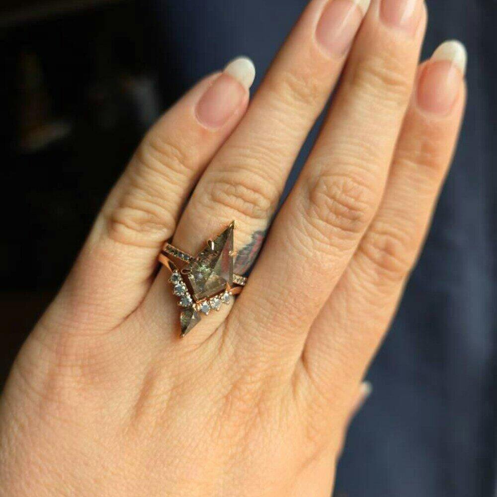 Absolutely stunning ring with a unique kite-cut salt and pepper diamond. The vintage design and curved band give it a timeless yet modern look. Craftsmanship is excellent, and it looks even more beautiful in person.
