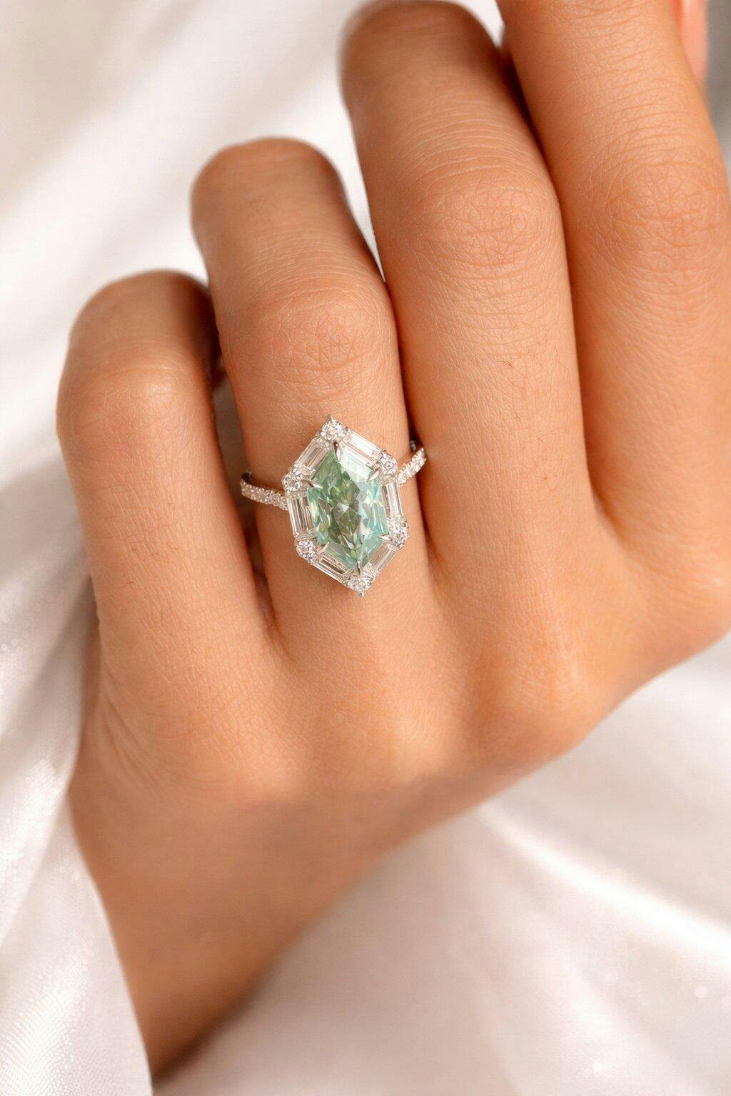 This ring feels like it was created for a once-in-a-lifetime moment. The hexagon-cut green moissanite is breathtaking, glowing with a rich, elegant brilliance that feels both modern and timeless
