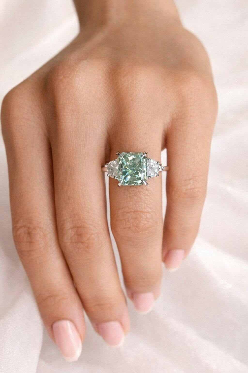 A truly show-stopping ring! The 8.10-carat light green moissanite sparkles brilliantly, and the three-stone design adds a perfect balance of elegance and luxury. A modern classic that turns heads.