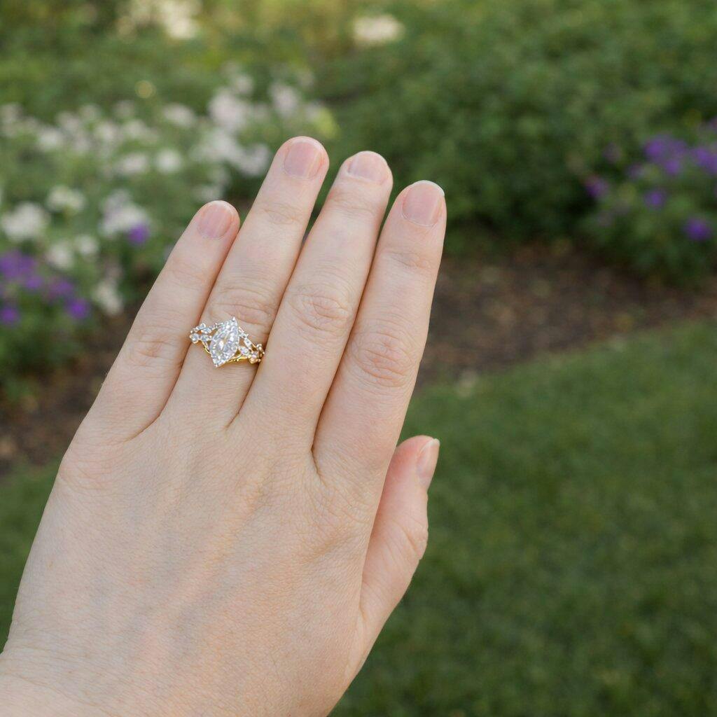An absolutely glamorous engagement ring with exquisite vintage charm. The marquise lab diamond sparkles brilliantly, and the leaf vine detailing adds an elegant, luxurious touch that feels truly unforgettable.